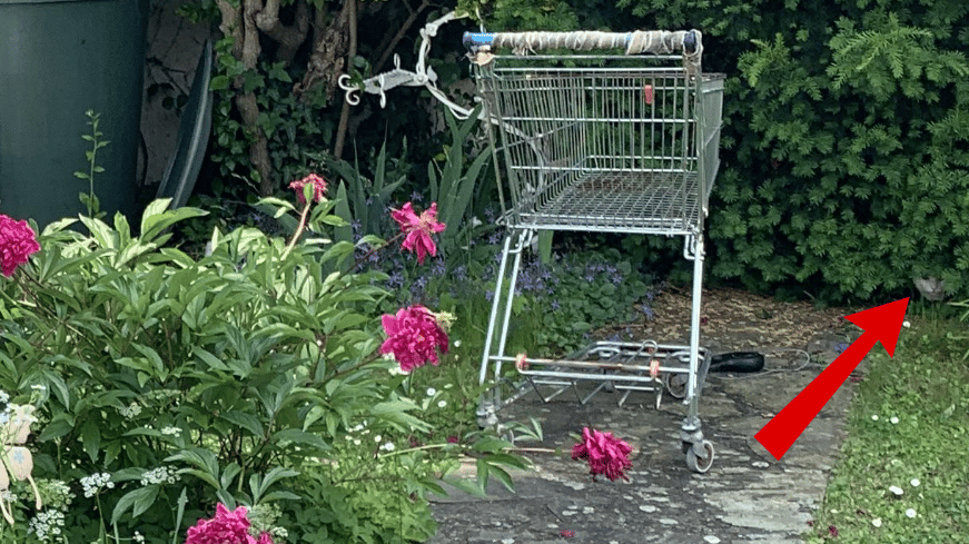 A primera vista, la tranquila escena parece mostrar un camino de piedra, un columpio tipo banco, un carrito de compras y una exuberante mezcla de flores rojas, rosas y blancas.