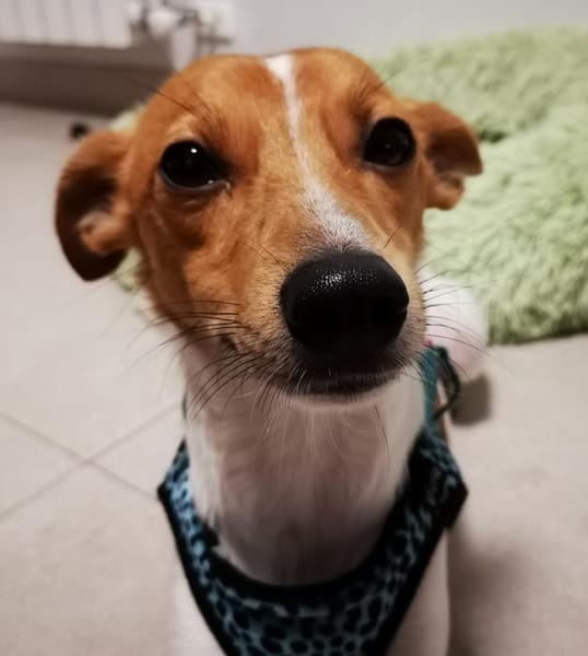 Puchero es muy cariñoso y sociable. Va muy bien en el coche y con correa. Ha sido rescatado antes de que su ex-dueño lo llevase a la perrera.